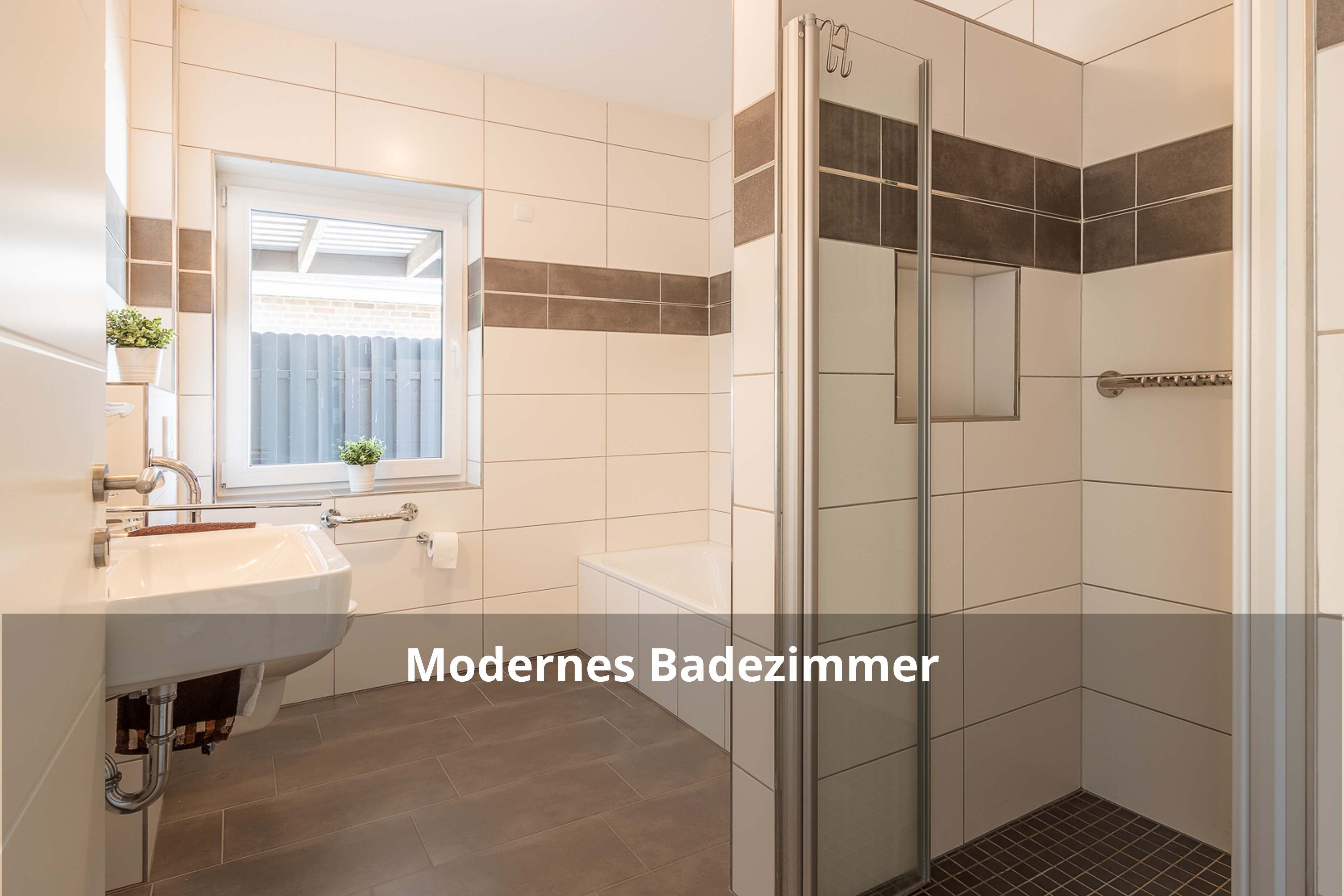 Das Tageslichtbad verfügt über eine Badewanne sowie eine separate Dusche. Neben dem Schlafzimmer stehen zwei weitere Räume zur Verfügung, die sich flexibel als Arbeits- oder Gästezimmer nutzen lassen. Ein separates Gäste-WC mit Tageslichtfenster rundet das Angebot ab und sorgt für zusätzlichen Komfort. Zudem bietet der moderne Bungalow durch einen funktionalen Hauswirtschaftsraum und den Dachboden genügend Stauraum für Ihre Bedürfnisse.