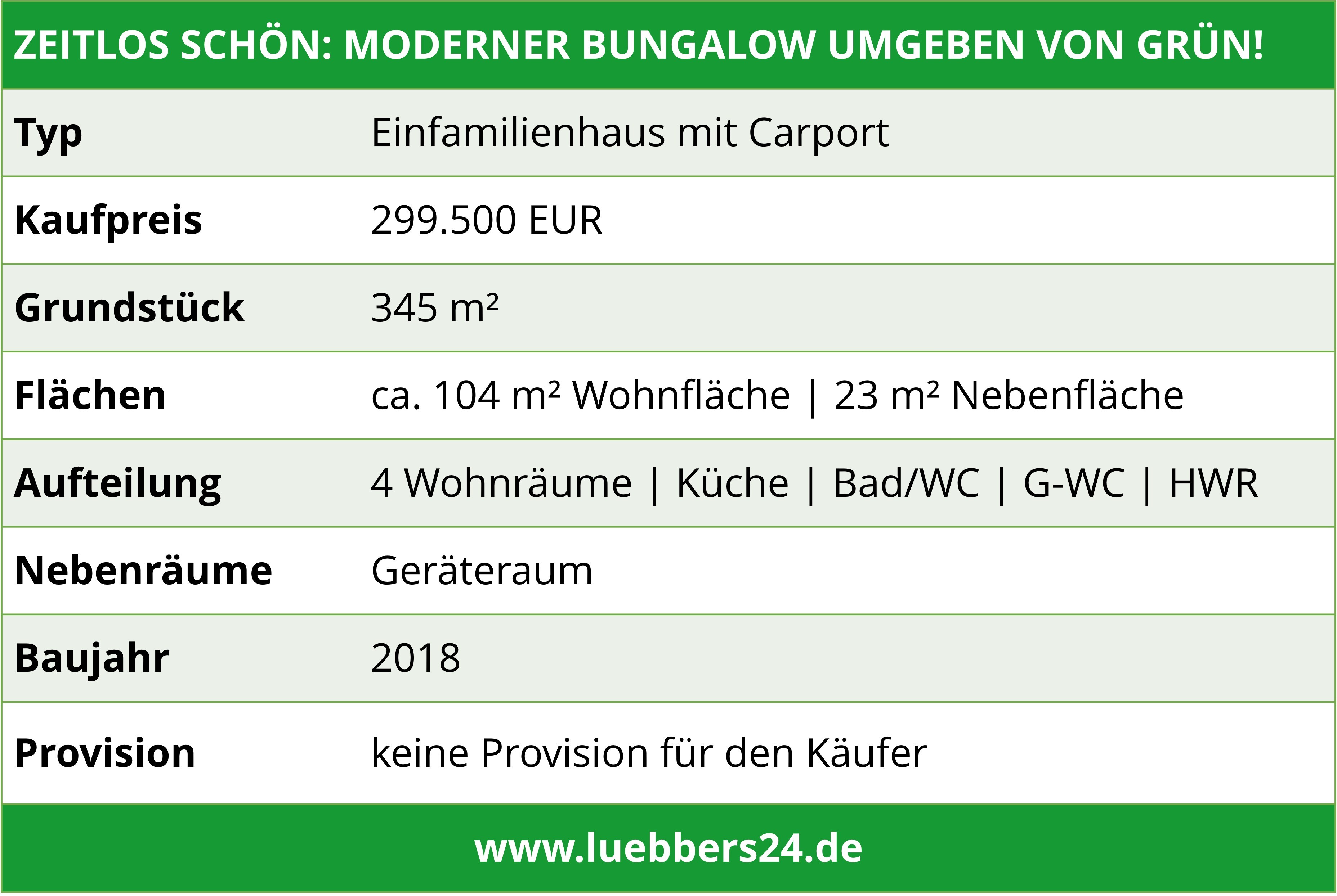 Schon beim Öffnen der Haustür spüren Sie die behagliche Wärme und Geborgenheit dieses jungen Bungalows. Alles liegt auf einer Ebene - praktisch, stilvoll und zukunftssicher. Ob Sie den Ruhestand planen, mehr Zeit für sich suchen oder einfach das Leben entschleunigen möchten - dieses Zuhause bietet Ihnen Raum für genau das, was zählt: Ruhe, Lebensqualität und ein Stück Freiheit im Grünen.