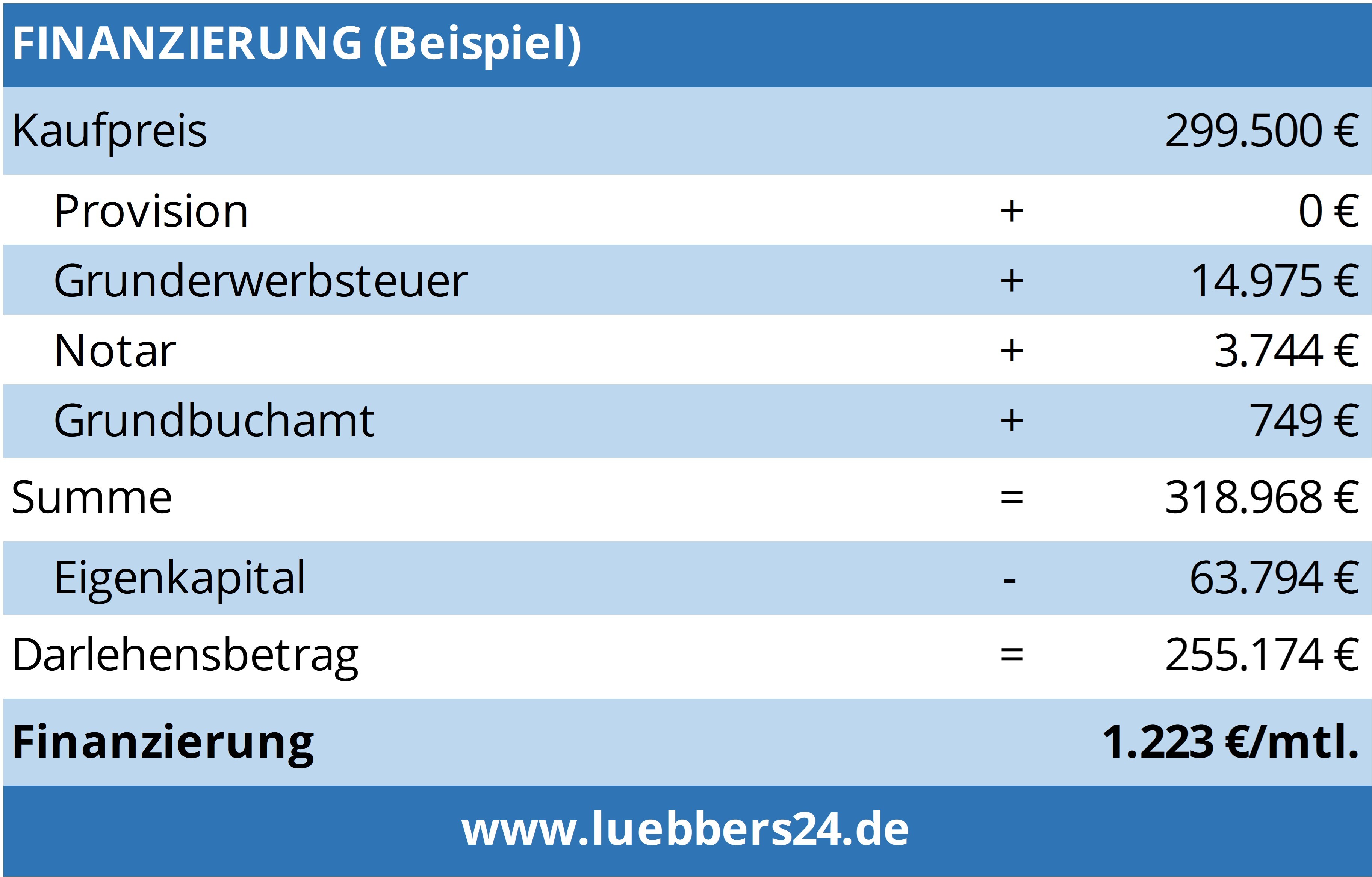 Die Finanzierung des Darlehensbetrags wurde mit 2,0% Tilgung pro Jahr und 3,75% Sollzins pro Jahr kalkuliert (Annuitätendarlehen, Zinsbindung 10 Jahre).