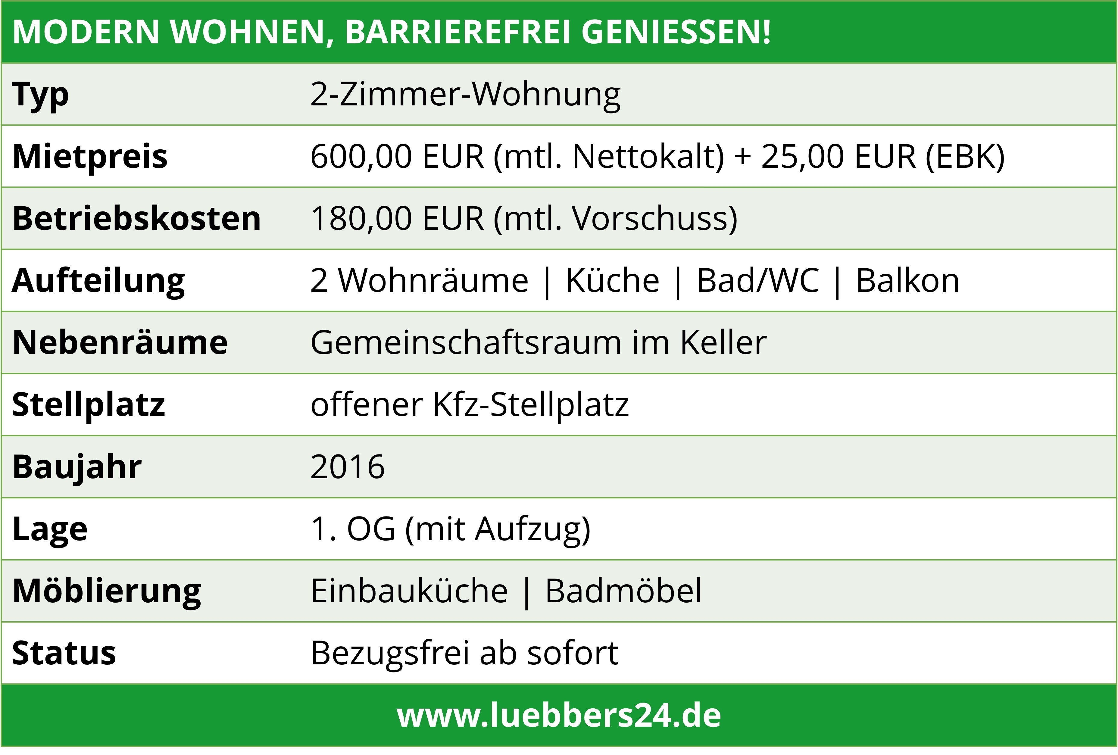 Die charmante 2-Zimmer-Wohnung in Haselünne bietet Ihnen alles, was das Herz begehrt. Sie befindet sich im 1. Obergeschoss des Gebäudes und kann durch einen Aufzug barrierefrei erreicht werden. Mit einer Wohnfläche von ca. 66,69 m² ist sie perfekt für alle, die Komfort und Stil schätzen.